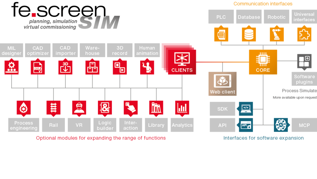 The use of fe.screen-sim is completely possible regardless of the industry. Currently, the software is already being used very successfully in plant and mechanical engineering, logistics, materials handling, automation and robotics.