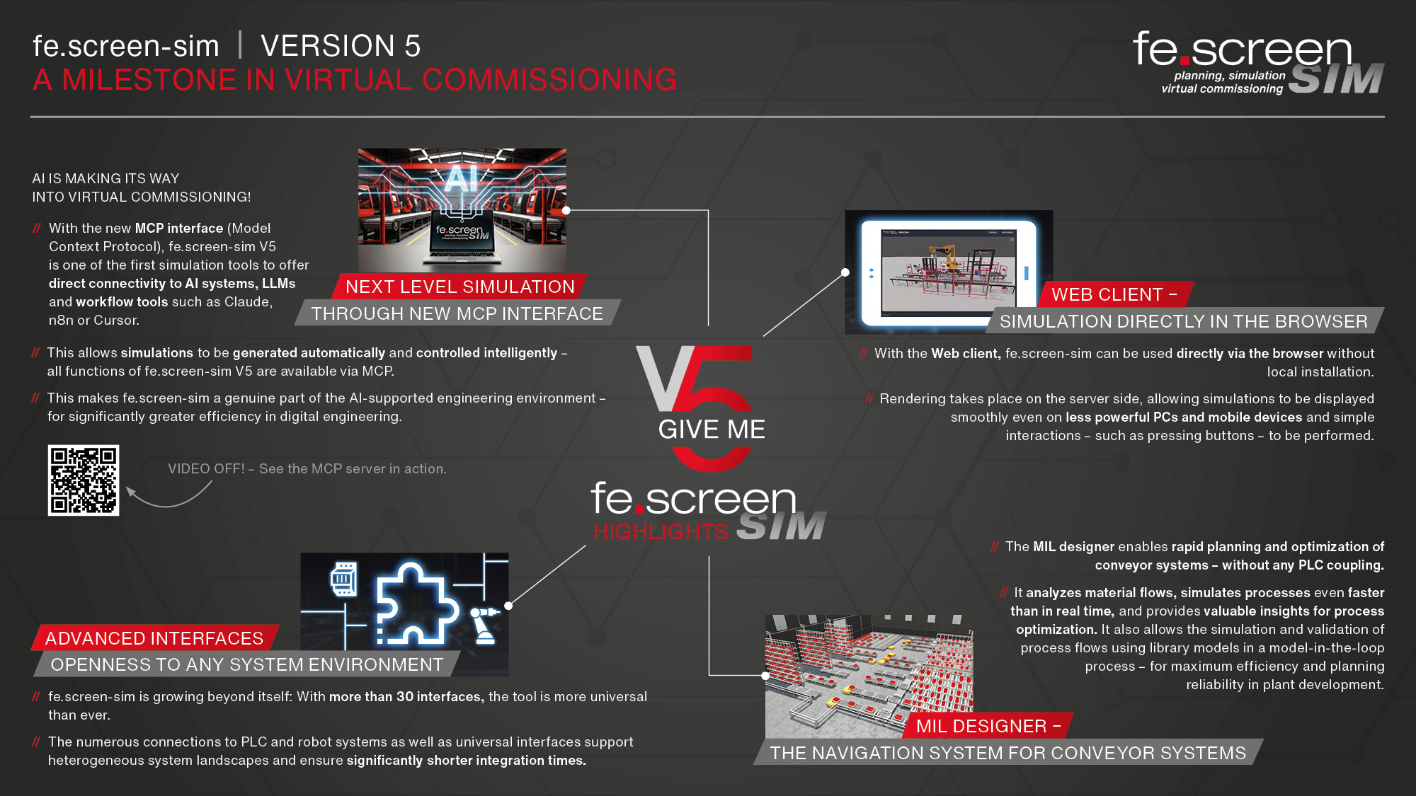 AI is making its way into virtual commissioning! With the new MCP interface (Model Context Protocol), fe.screen-sim V5 is one of the first simulation tools to offer a direct connection to AI systems, LLMs, and workflow tools such as Claude, n8n, and Cursor. This allows simulations to be generated automatically and controlled intelligently – all fe.screen-sim V5 functions are available via MCP. This makes fe.screen-sim a genuine part of the AI-supported engineering environment – for significantly greater efficiency in digital engineering.