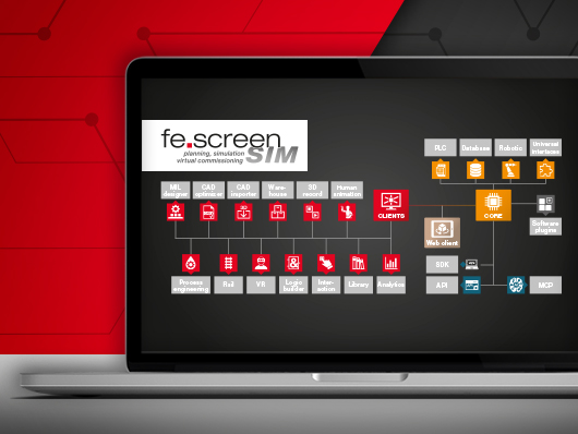 - fe.screen-sim enthält einen Objektkatalog, der schnell, fl exibel und beliebig kombiniert werden kann. Die Einsatzbereiche sind breit gefächert – vom Maschinenbau bis zur Logistik.
